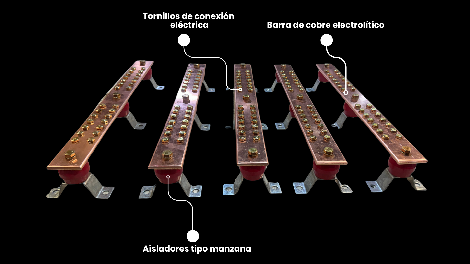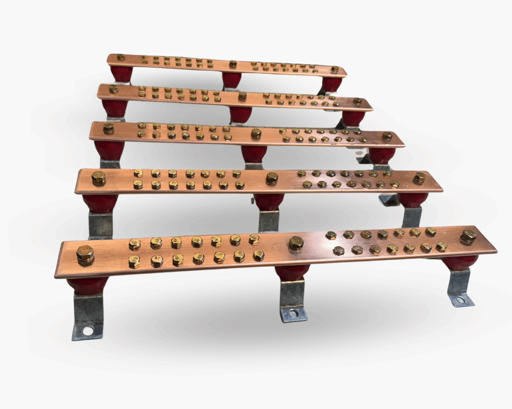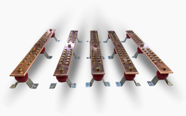 Ofrecemos sistemas de barras de cobre electrolítico de alta conductividad, montadas sobre aisladores tipo manzana, diseñadas para aplicaciones de distribución y puesta a tierra en instalaciones eléctricas industriales y comerciales.